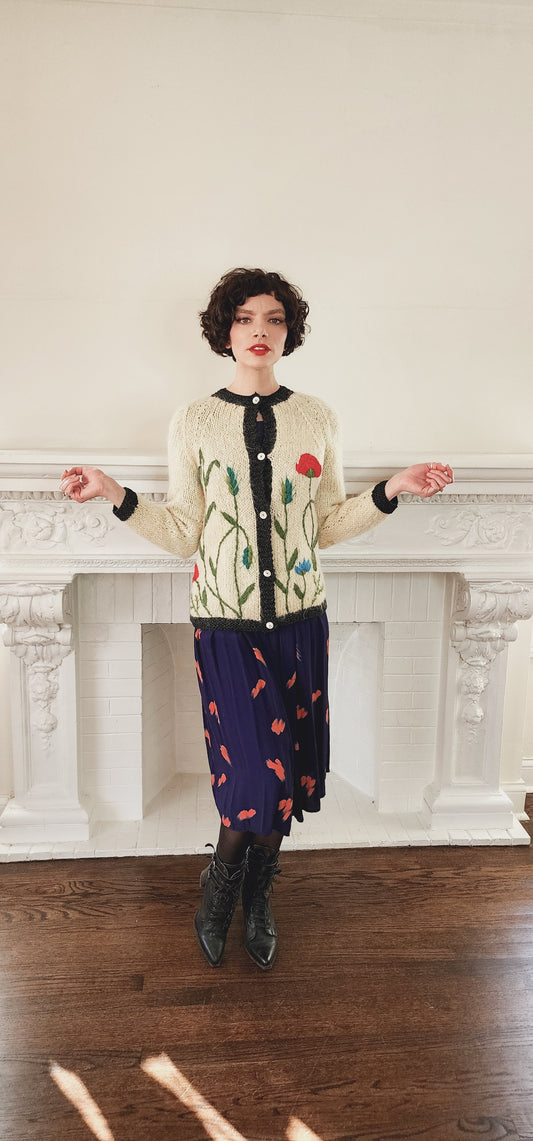 1960s Handknit Cardigan Cream Wool Blend Colorful Garden Flowers James Kenrob M