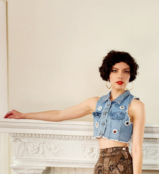 80s Denim Crop Top Vest in Distressed Blue Jean Cotton by Venus Attitudes / S