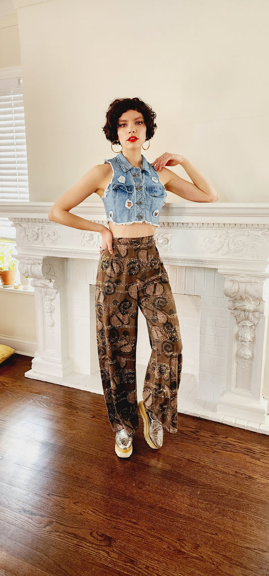 90s Does 60s Rayon Blend Print Pants, Wide-leg in Brown Black Cream / Medium