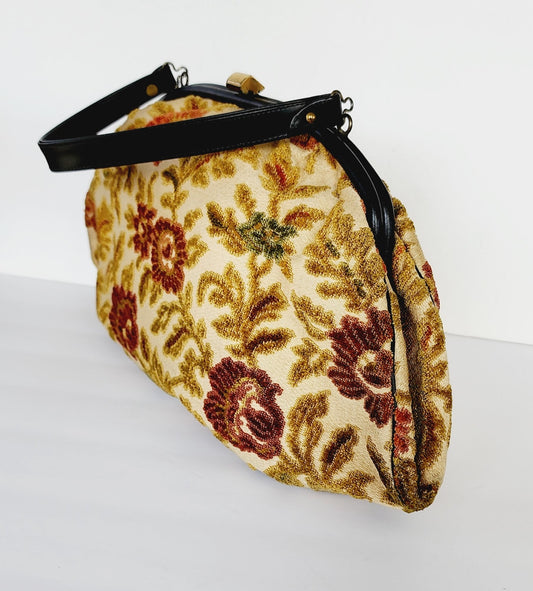 1960s Tapestry Bag Oversized Purse in Beige and Red Flowers