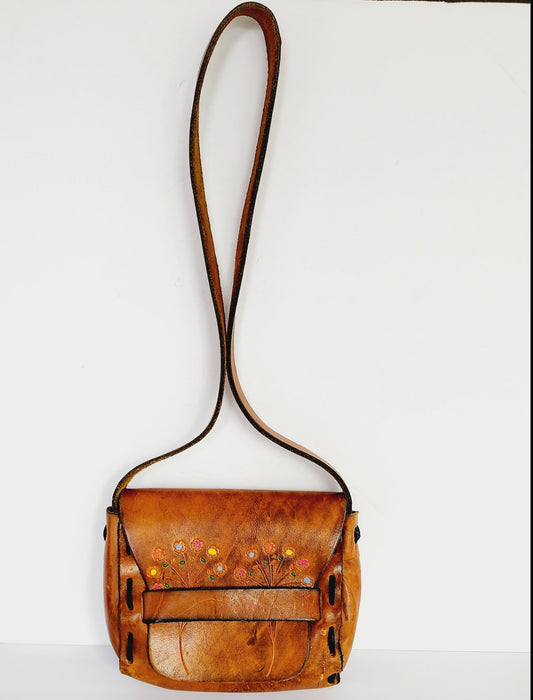 1970s Brown Hippie Shoulder Bag in Distressed Tooled Leather w/Colorful Flowers