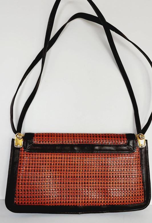 1970s Brown and Orange Leather Shoulder Bag with Lattice Woven Texture