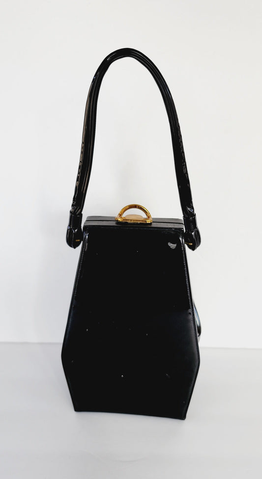 50s Black Patent Leather Bag with Top Handle / Oblong Geometric MCM Modernist Style by Lewis