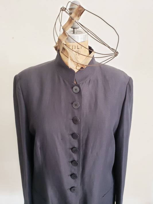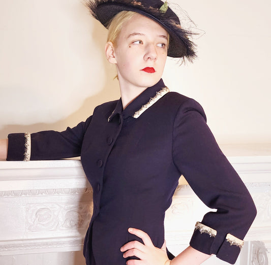 40s or 50s Navy Blue Wool Blazer w/Beaded Embroidery Bramson