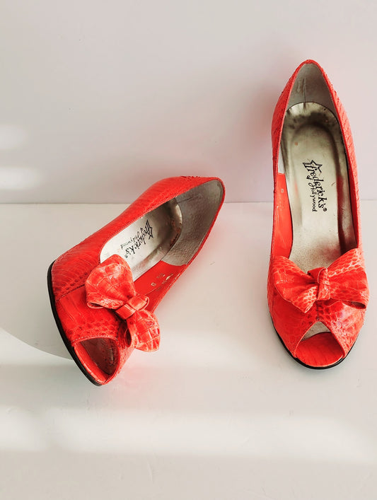 1980s Red High Heels w/Bows Faux Snakeskin Fredericks of Hollywood 8.5