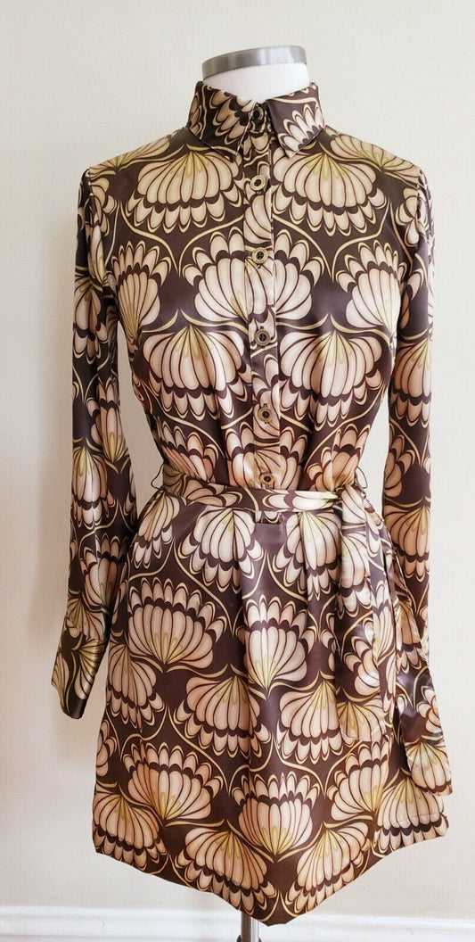 Button Down Long Sleeved Dress Designer Michael Kors Retro Print Pattern Brown Gold Swirly Pattern