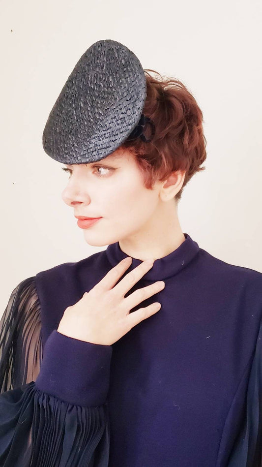 1950s Navy Blue Straw Mini Hat / 50s Mini Platter or Saucer Hat with Velvet Bows Mar-Field marshall Field & Co