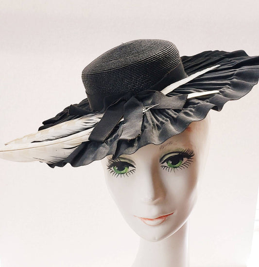1930s Black Pleated Cocktail Hat Wide Brim with White Feathers / 30s Cocktail Hat Angela Oak Park / Kata