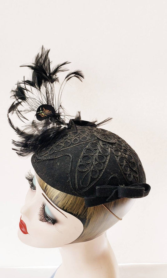 1930s Black Embroidered Cocktail Hat with Asymmetrical Black Feathers / 30s Avant Garde Modernist Evening Hat / Adalene
