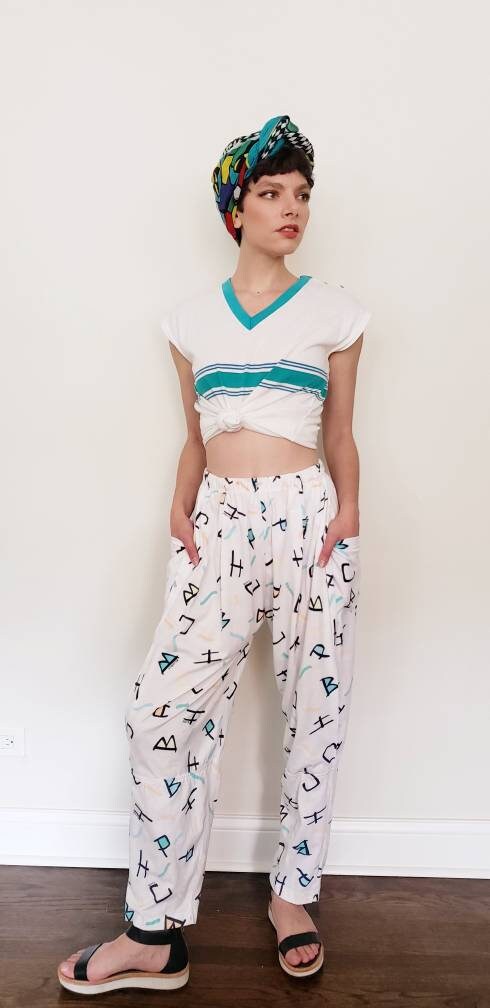 1980s Elastic Waist Pants Graphic Print Beverly Hills Polo Club / 80s Soft Pants with Pockets White Pastel Pattern Letters Logos / Cheney