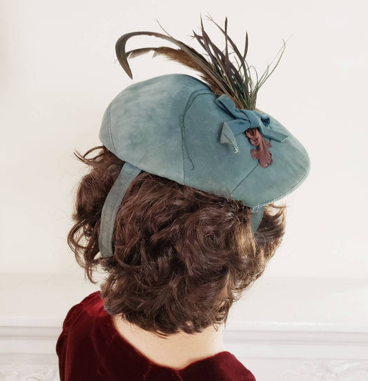 1940s Aqua Green Suede Beret Style Hat with Feather / 40s New York Creation McCurdy's Hat Robin Hood Style