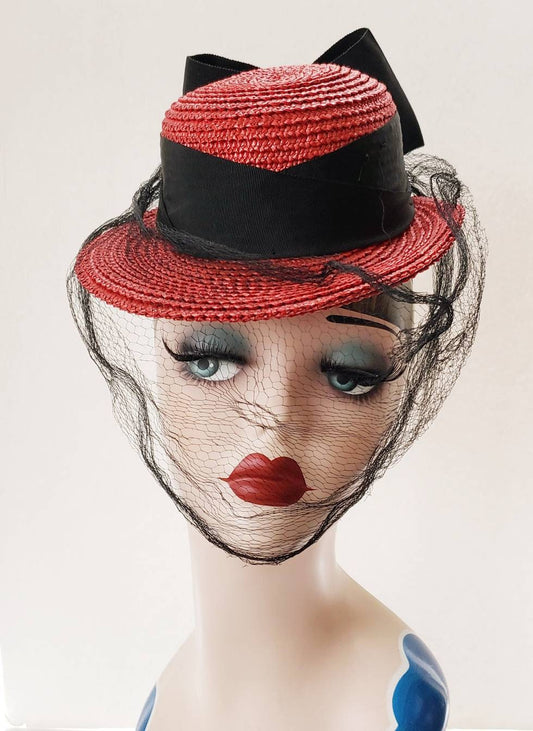1930s Red Straw Toy Hat Large Black Bow / 30s Toy Hat Summer Cocktail Evelyn Varon New York Creation