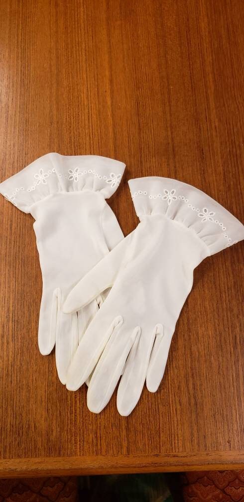 1950s White Nylon Cuffed Gloves / 50s Cocktail Gloves Eyelet Lace Ruffle Wedding Bridal / Feminine Frilly / Norma