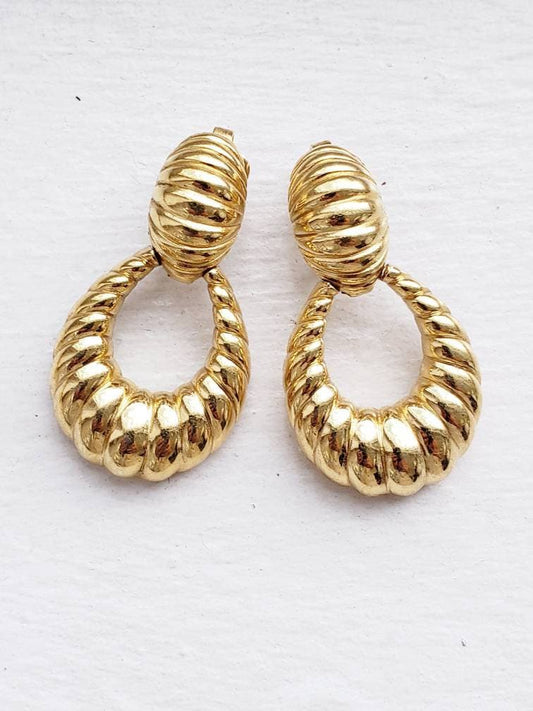 1990s Trifari Gold Dangle Earring Clips / 90s Costume Jewelry Gold Ribbed Dangly Hoops Drop Clip Ons / Alita