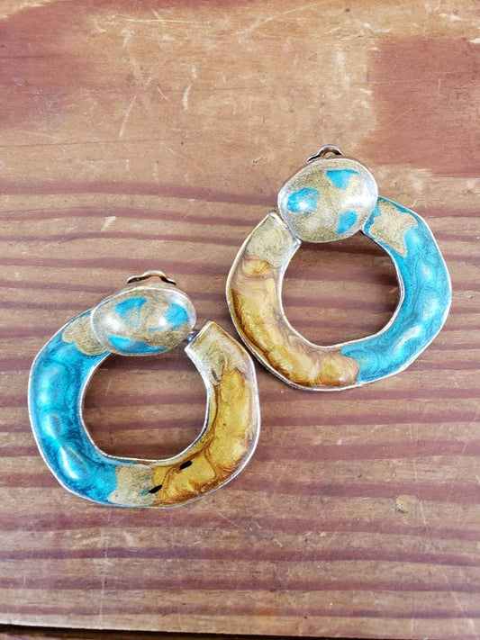 1980s Large Earrings Clips Blue Gold Enamel Hoops / 80s Clip-On Earrings Bold Chunky Maximalist Hoops / Aurore