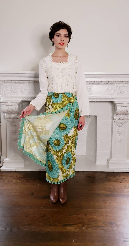 1970s 1960s Maxi Skirt Blue Gold Floral Print Pom Poms / 70s 60s Hippie Boho Skirt Bold Loud Print Ball Fringe / M / Selene