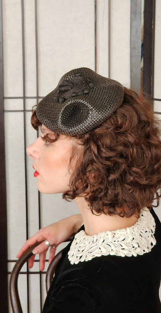 50s Black Straw Beanie Hat Junia Carson Pirie Scott Modernist