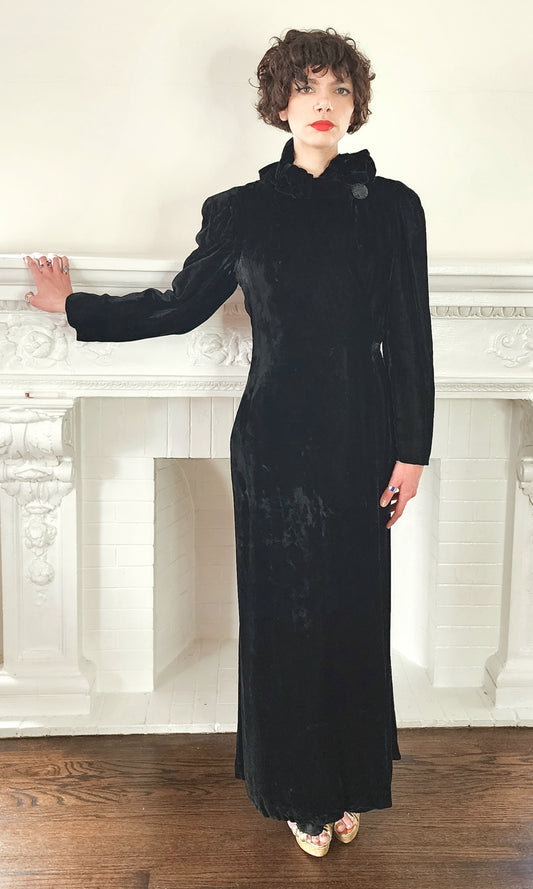 1930s Black Velvet Opera Coat Maxi Length Ruffled Collar / 30s Evening Wm Taylor & Sons M to L / Duteille