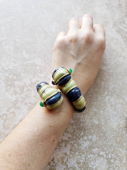 1960s Kenneth Jay Lane Hinged Bracelet Worm Slug Creature / 60s Designer Cuff Blue Green Enamel Fantasy Whimsical Insect Animal / Glaris