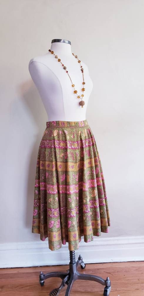 1950s Graphic Print A Line Midi Skirt / 50s Summer Skirt Green Pink Mustard Yellow India Cotton Print / S / Archana