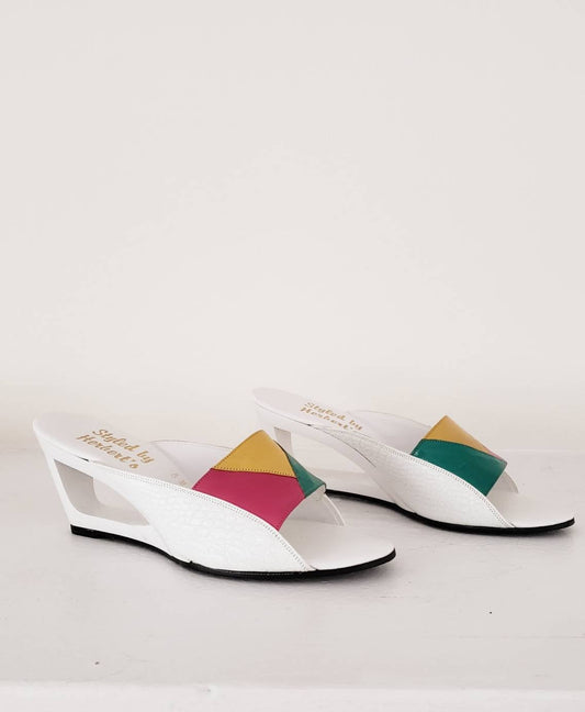 1980s Summer Wedge Sandals Colorful Leather Mules / 80s Cut Out Wedge Heel Slides Slip On Summer Shoes Patchwork Leather / 8