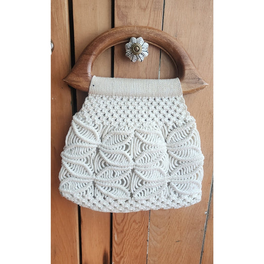 Vintage 70s Macrame Hand Bag Cream White Crochet Purse Wood Handle