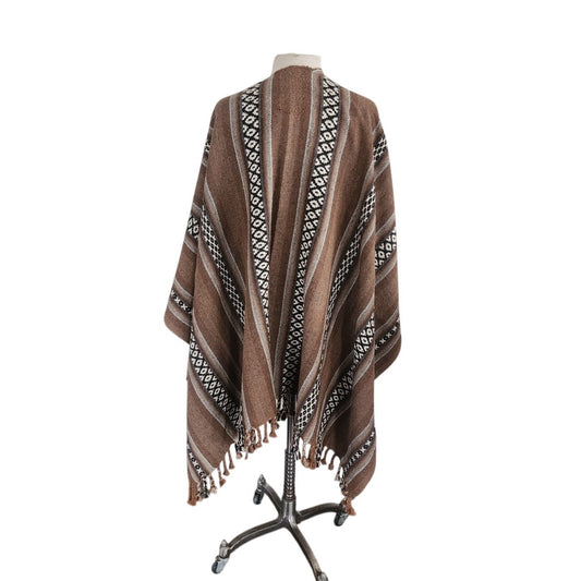 Vintage Fotrama Poncho Alpaca Wool Brown Cream Striped w/Fringe Handmade Ruana Bolivia