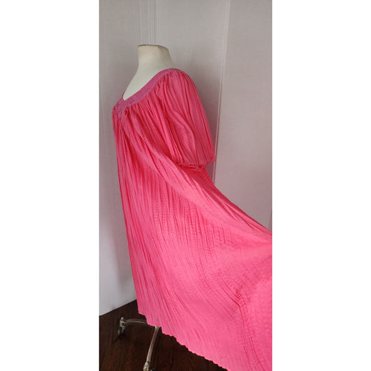 Vintage 1970s Pink Summer Dress Caftan Tent Moomoo Crinkled Pleating & Crochet