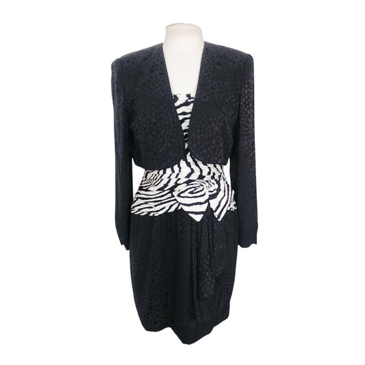Vintage 1980s AJ Bari Strapless Dress + Bolero Jacket Suit Set Zebra Print Black White Silk / M