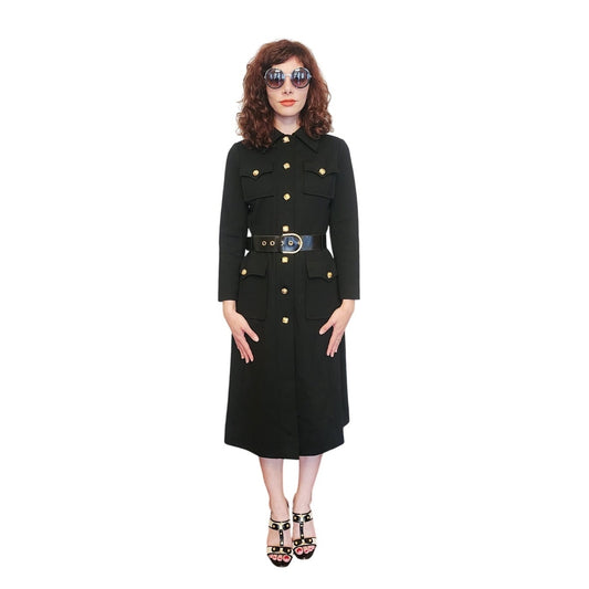 Vintage 1960s Dress Black Knit Wool + Gold Buttons, Belted by Gibi Italy