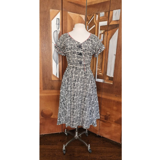 Vintage 50s Black White Abstract Print Fit and Flare Dress Tiki MCM Cotton Print Rockabilly / M