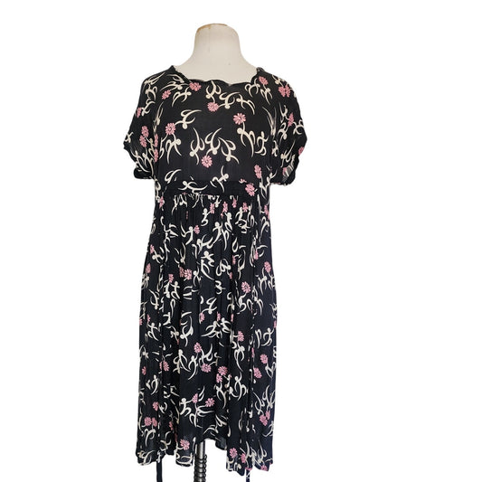 Vintage 1930s Rayon Print Maternity Dress Adjustable Tie Sash Dark Floral Print