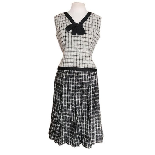 Vintage 60s Mod Suit Pleated Midi Skirt + Top Gray Black Wool Tweed