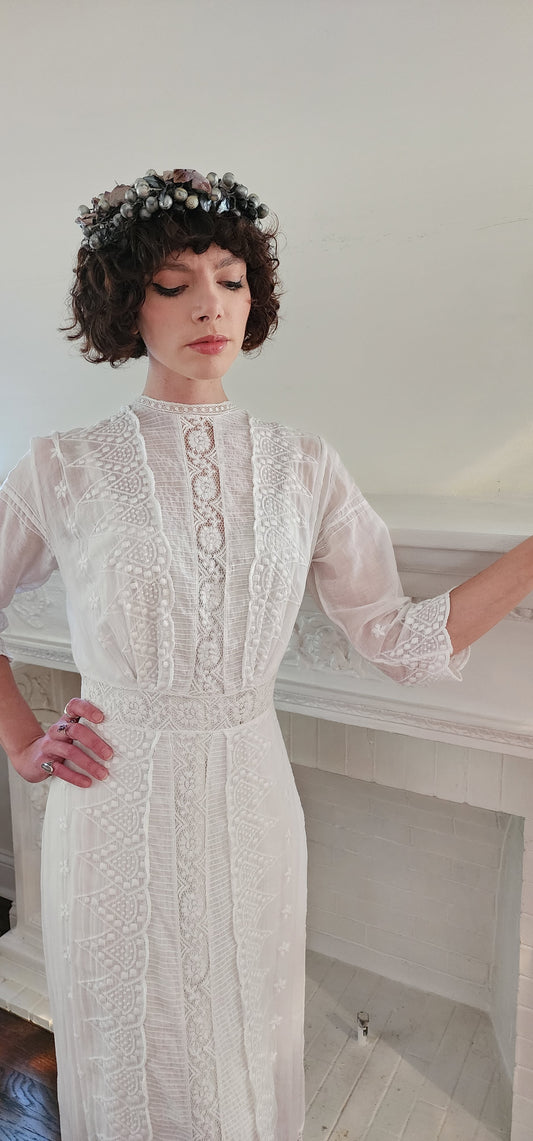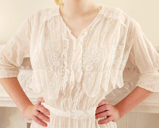 1910s White Cotton Lawn Dress Edwardian Tea Frock Floral Embroidery Lace Small