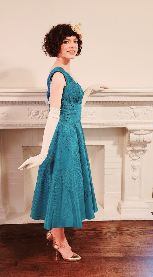 50s Aqua Blue Silk Ribbon Party Dress by Smart Miss / S