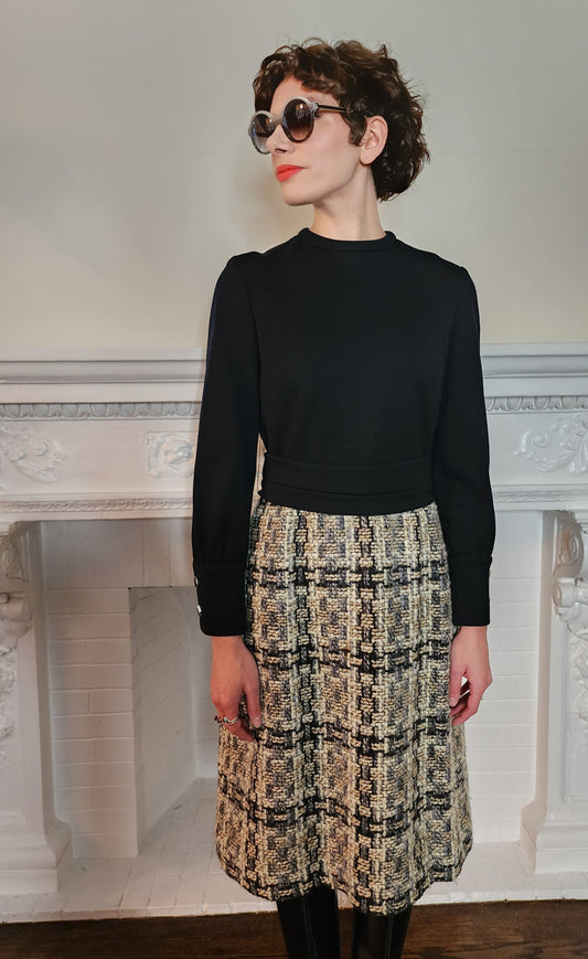 1960s Mod Dress in Black & Gray Plaid with Long Sleeves Large