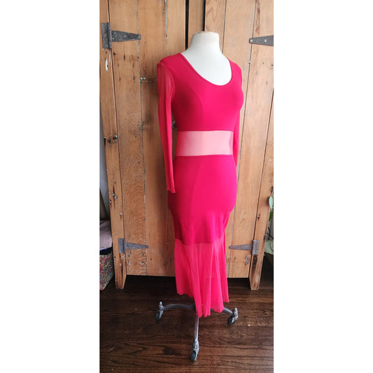 Vintage 90s Red Party Dress Long Bodycon Sheer Panels / Halla / S