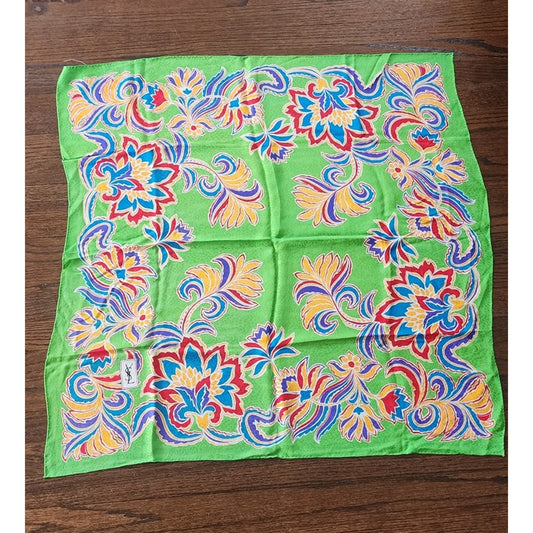 Vintage YSL Scarf Silkprint Square Floral Paisley Green Yves Saint Laurent 1970s 1980s