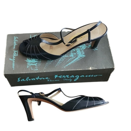 Vintage 70s Ferragamo Navy Blue Leather T Strap Dancing Shoes Mary Jane Heels 10AA