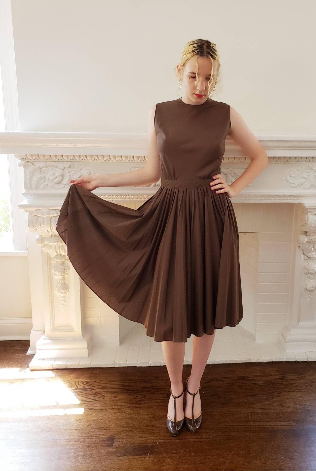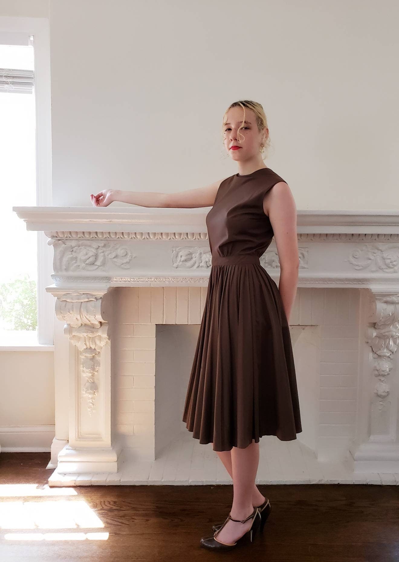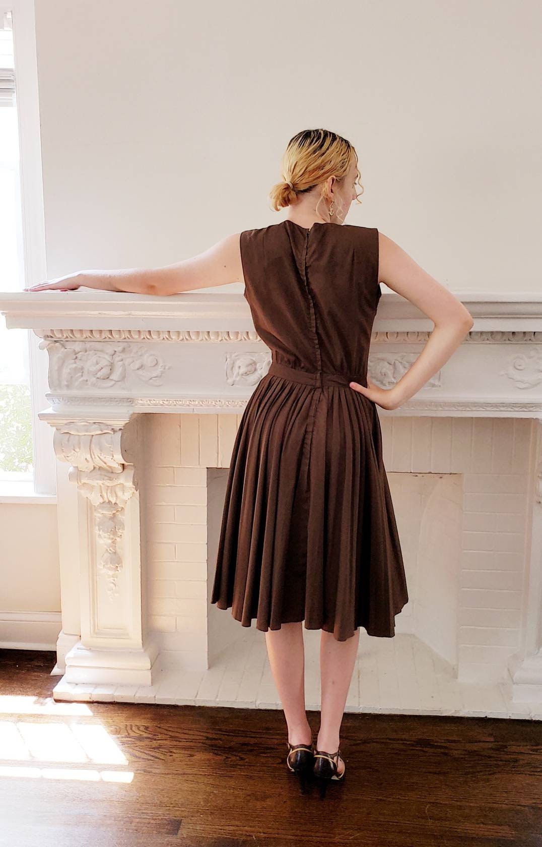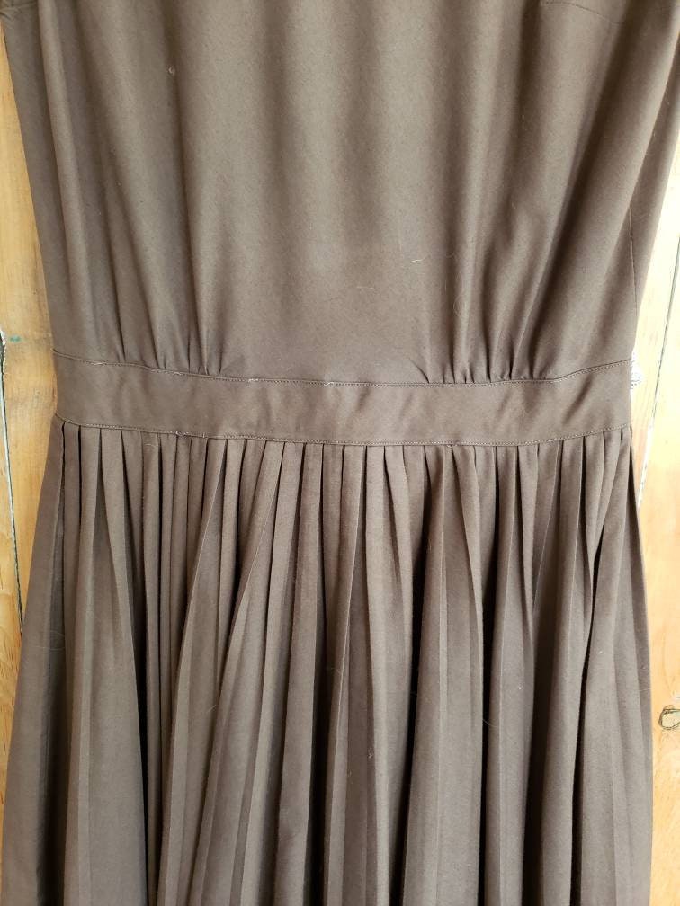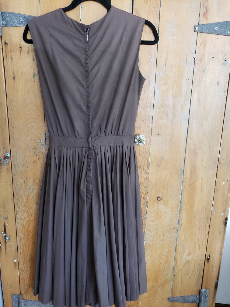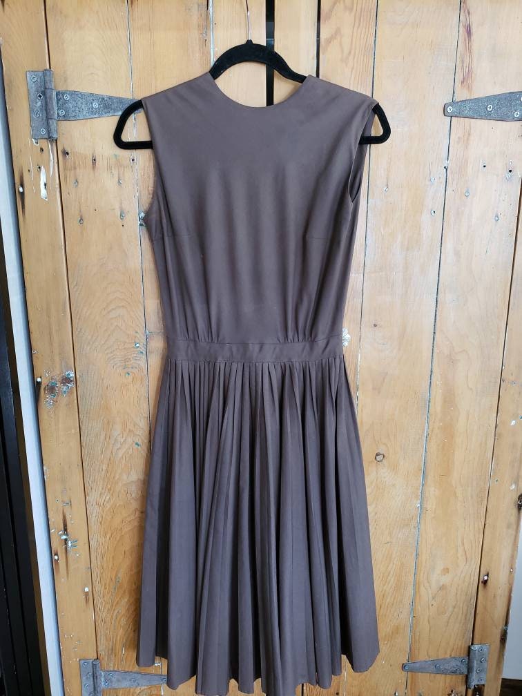 Cut out of a solid colored, chocolate brown cotton blend, it is sleeveless with a high, crew neckline, fitted chest, nipped waist and a full skirt with pleats! Closes with a zipper down the back.