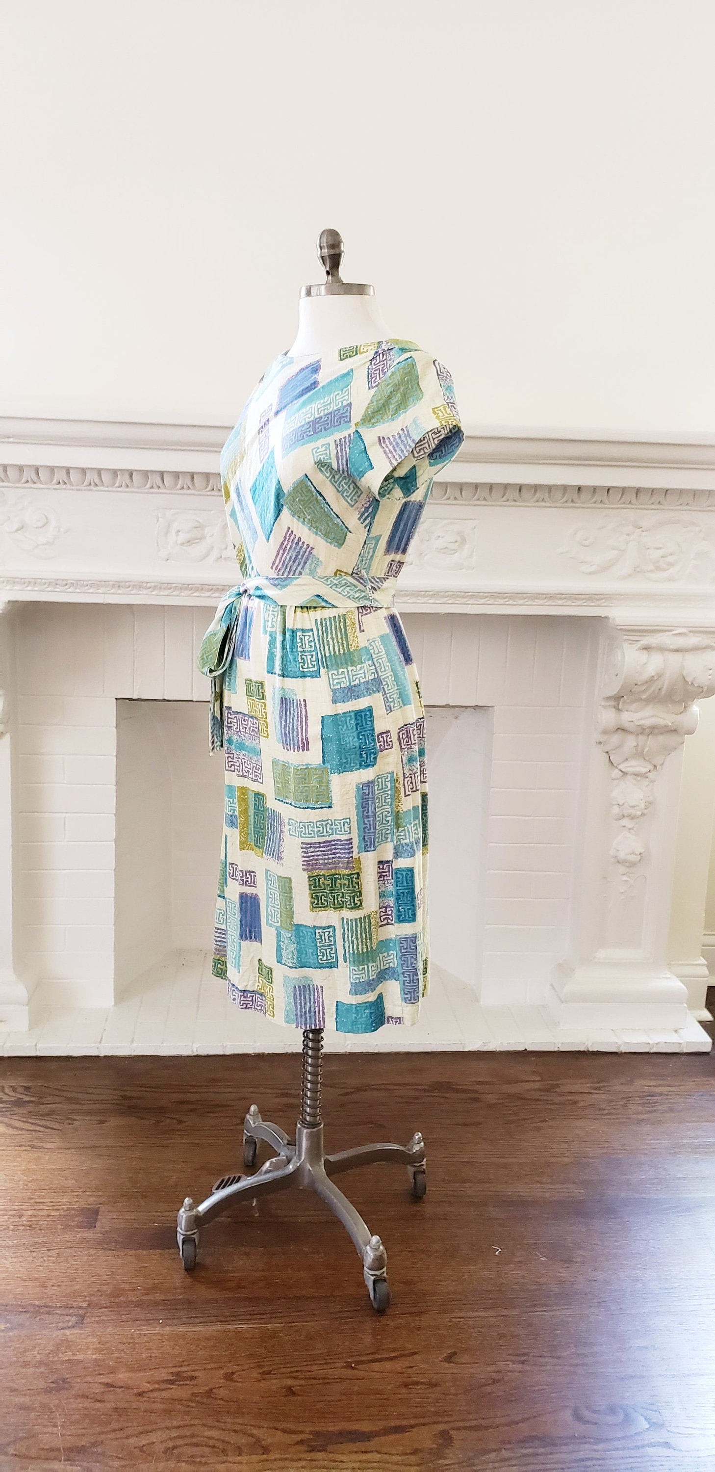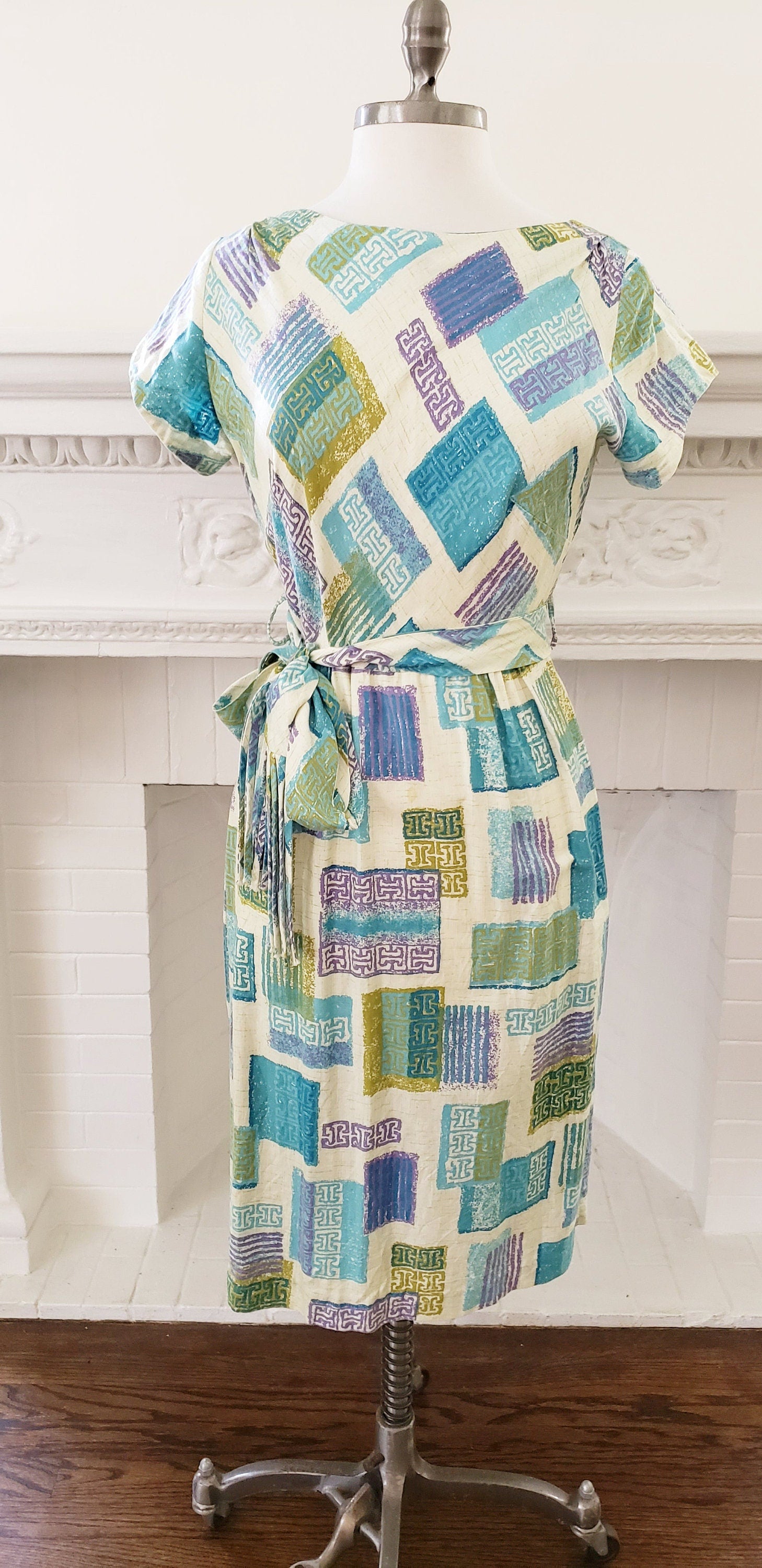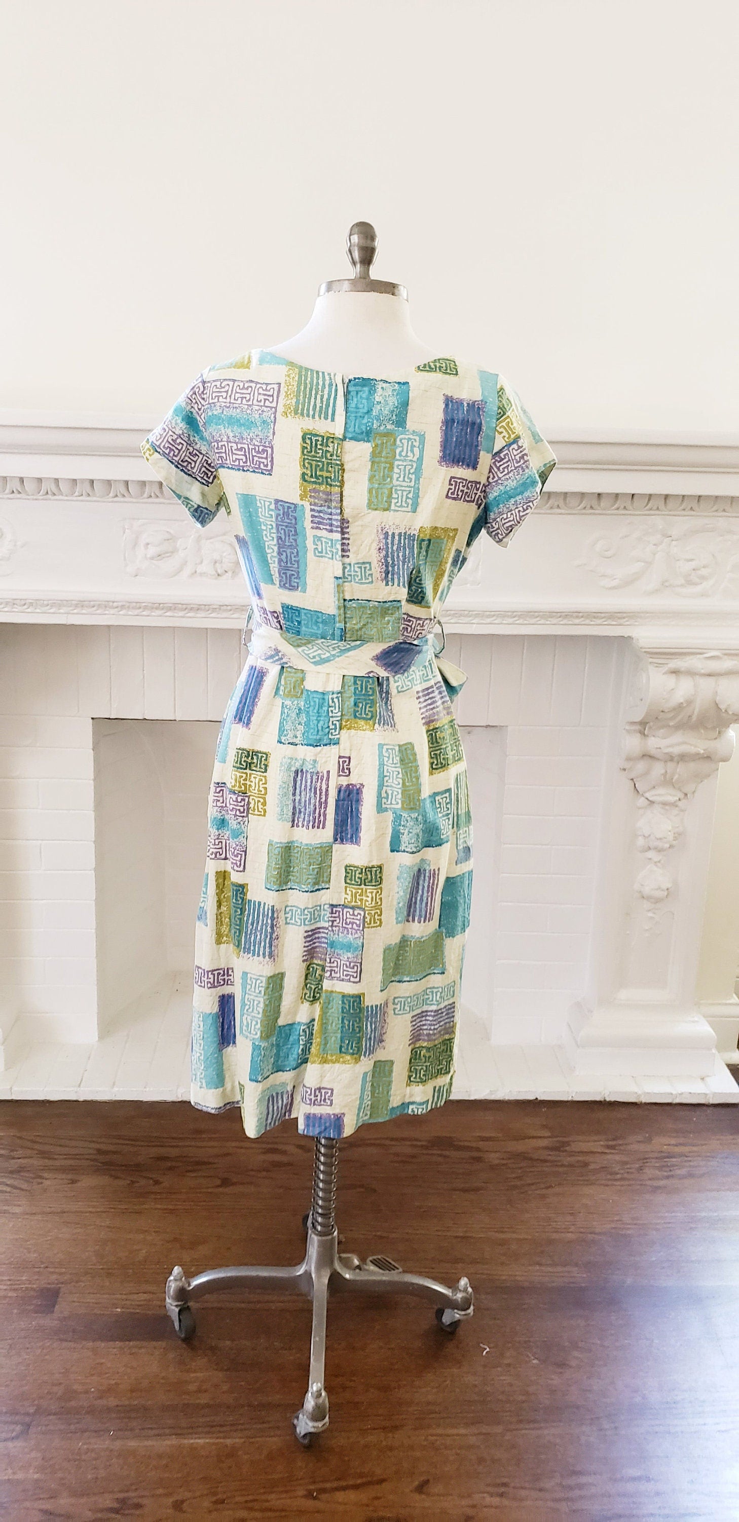 11950s Cotton Print Day Dress Blue Green White Midcentury Modern Print / 50s Geometric Print Belted Summer Dress Capped Sleeves / M Daveney