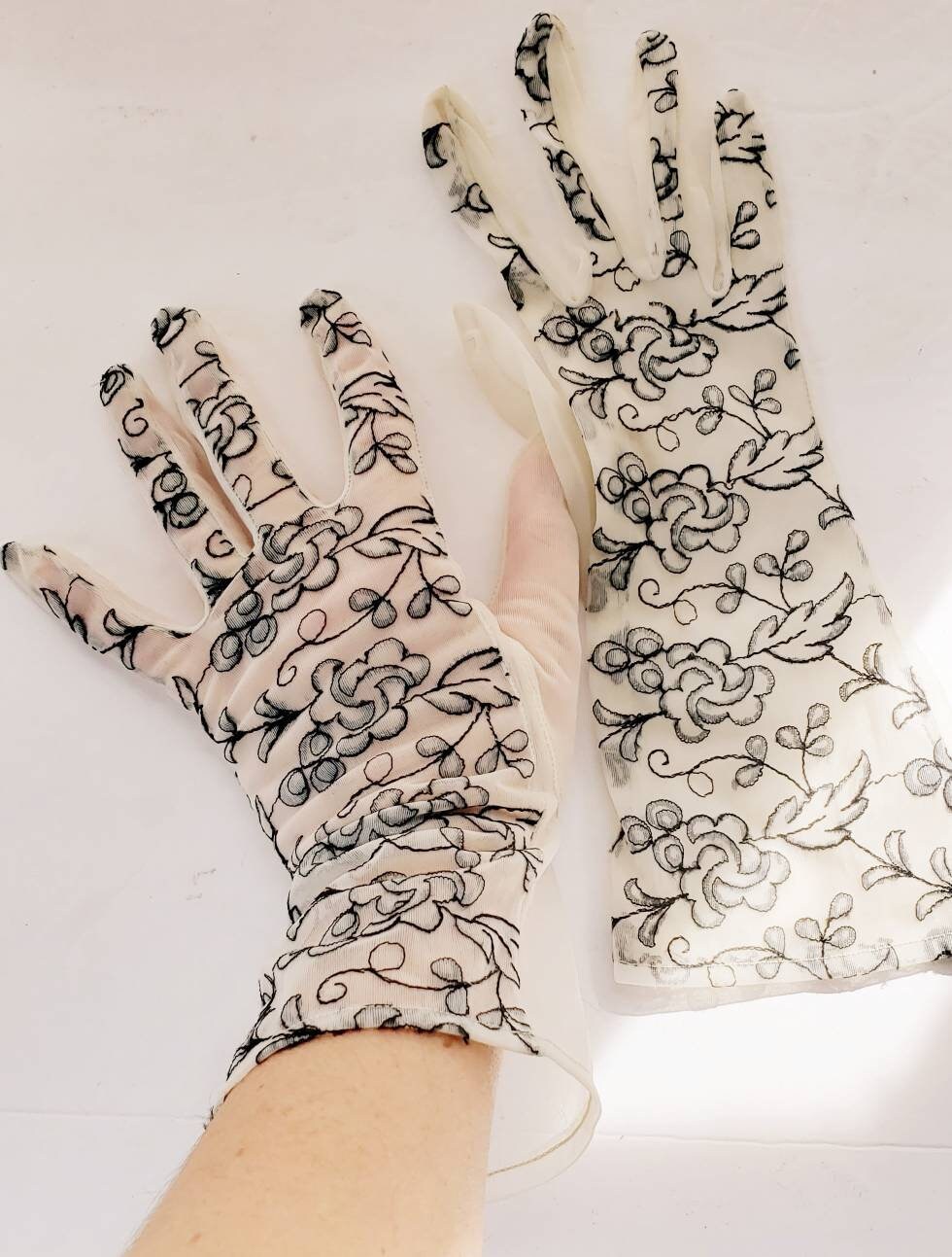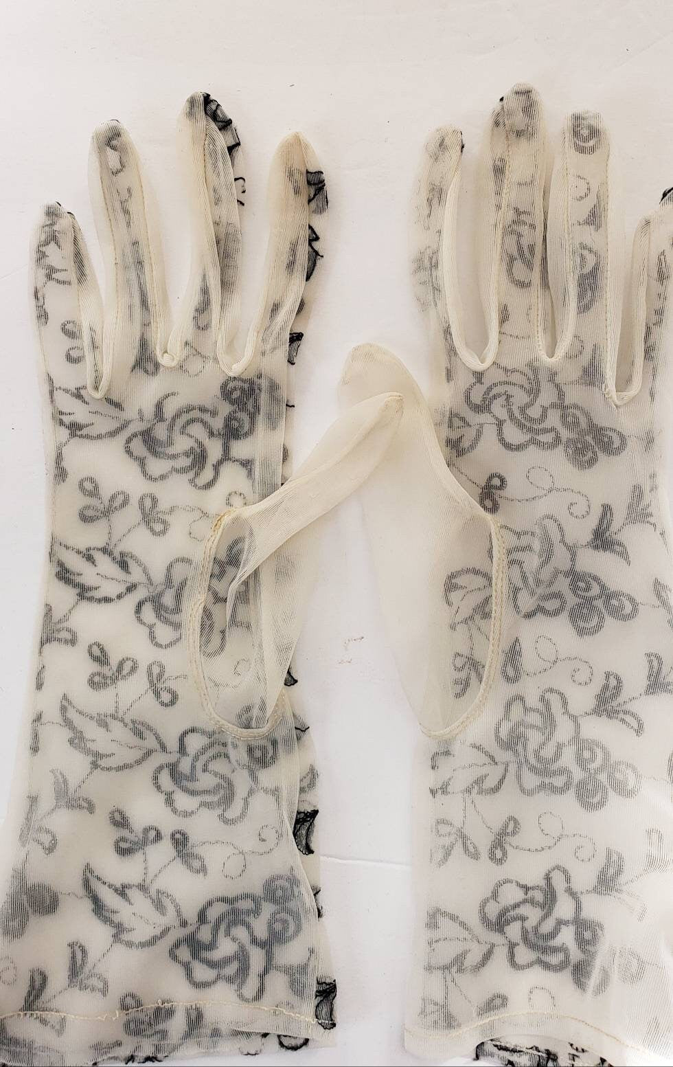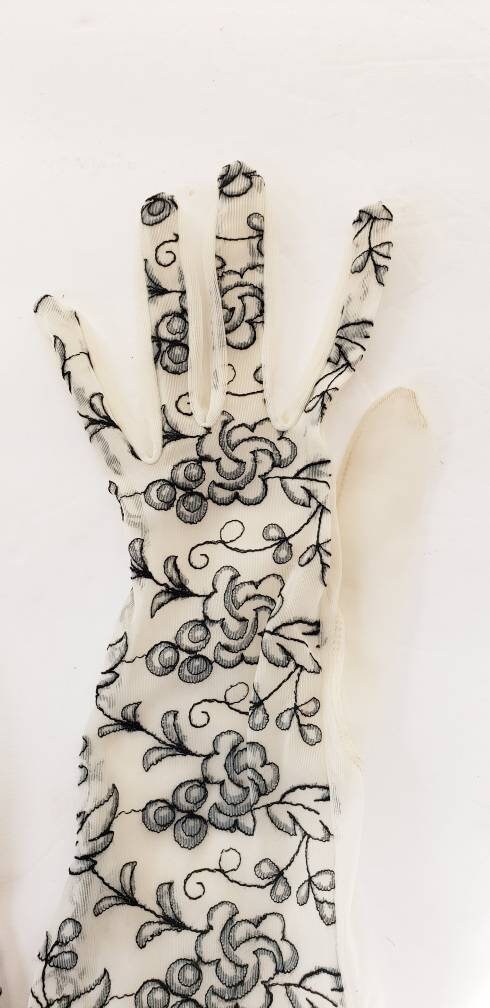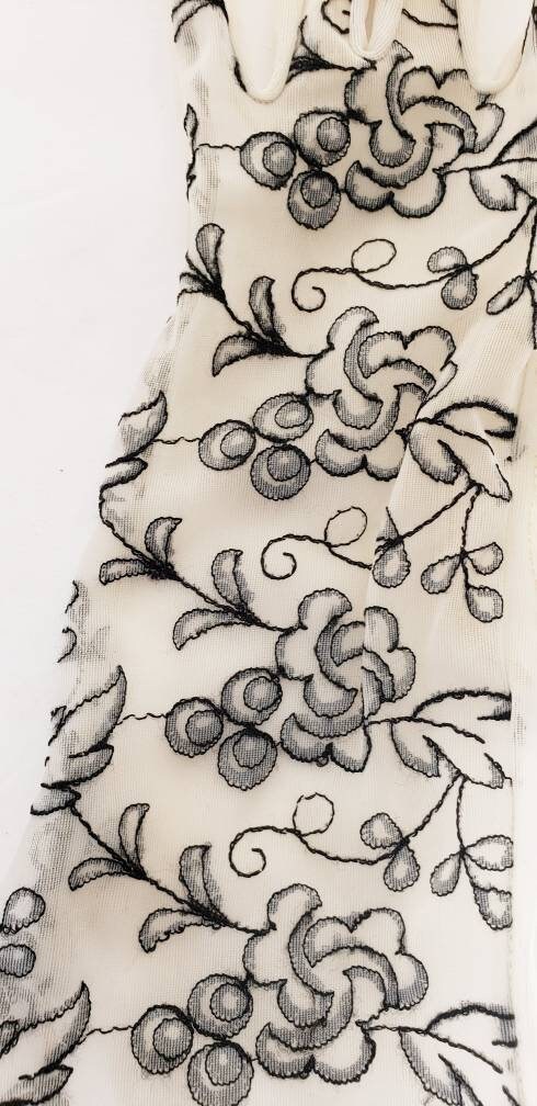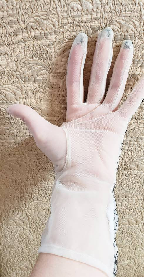 Delicate and romantic gloves in a sheer, creamy beige mesh nylon fabric, the tops of which are covered in black floral embroidery. They go just past the wrist, halfway to the elbow. The interior or palm side is solid sheer. No tags. They have some stretch, thanks to the material.