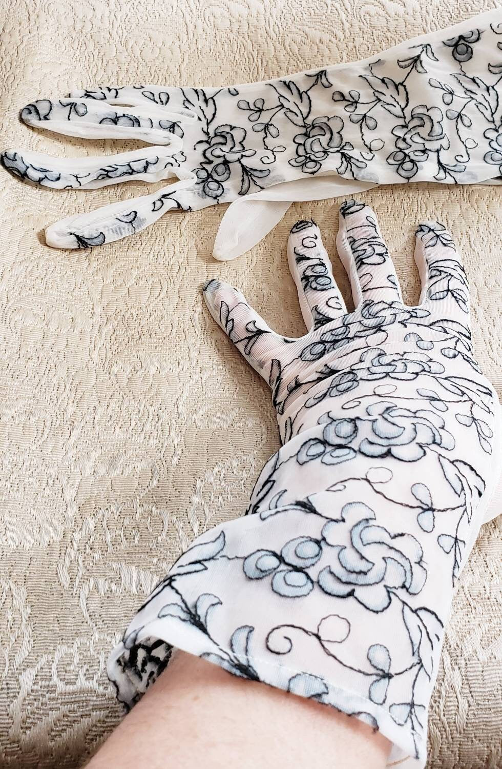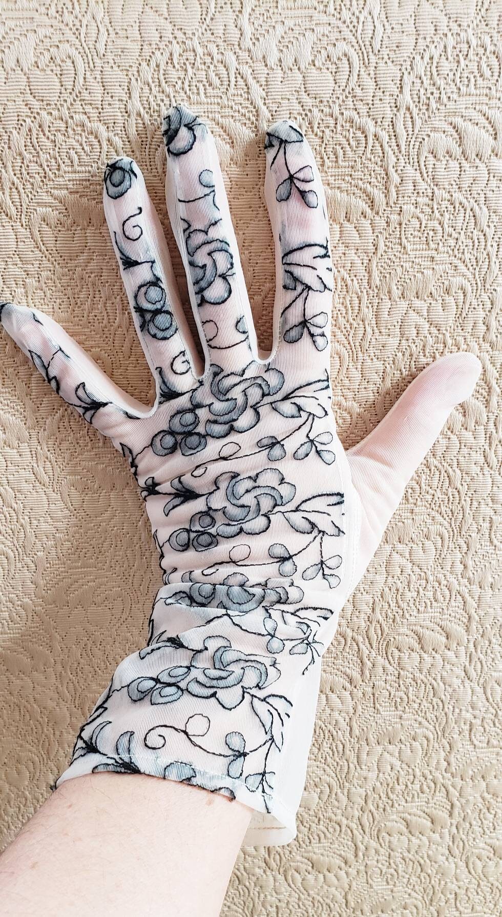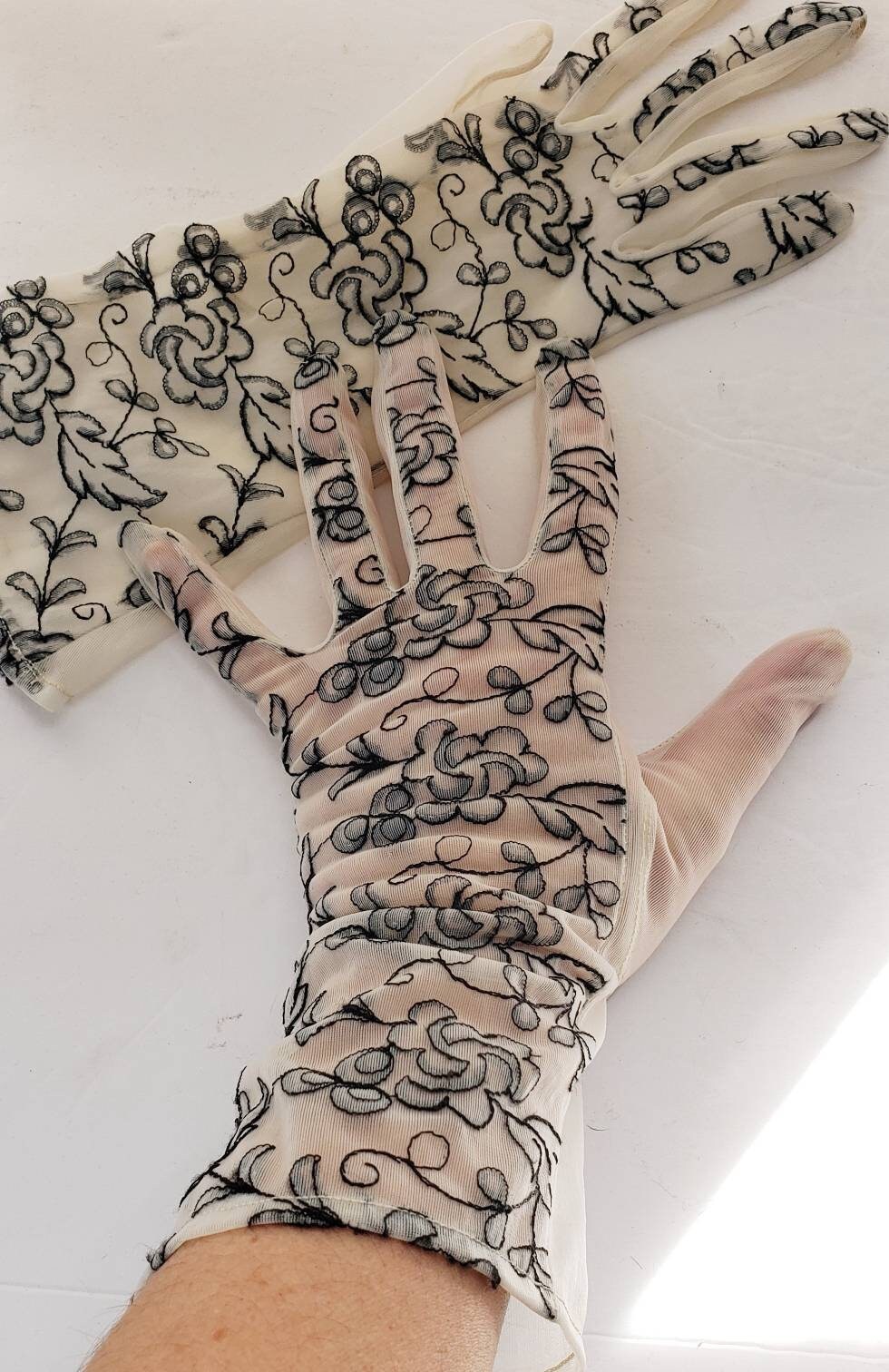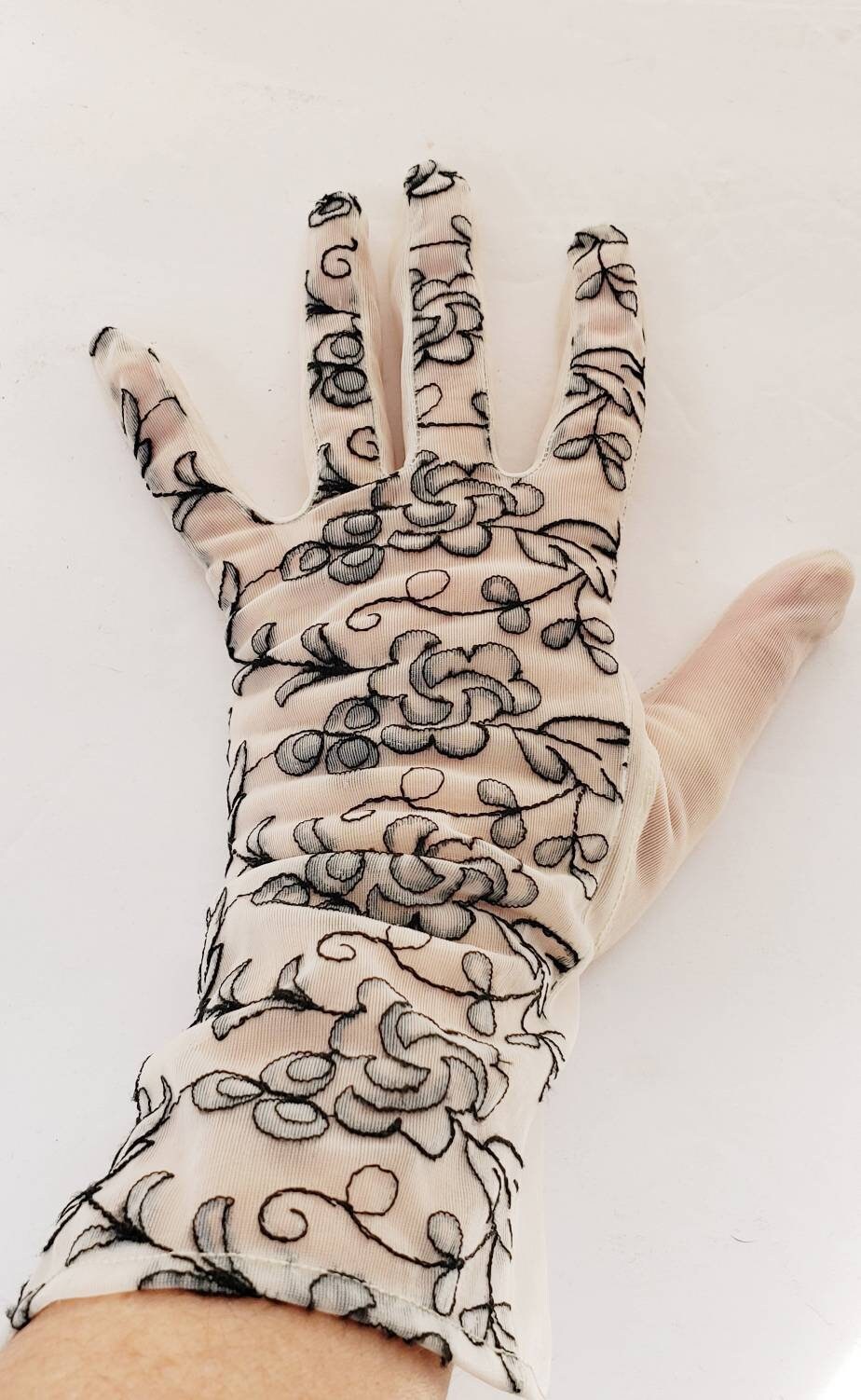 Delicate and romantic gloves in a sheer, creamy beige mesh nylon fabric, the tops of which are covered in black floral embroidery. They go just past the wrist, halfway to the elbow. The interior or palm side is solid sheer. No tags. They have some stretch, thanks to the material.