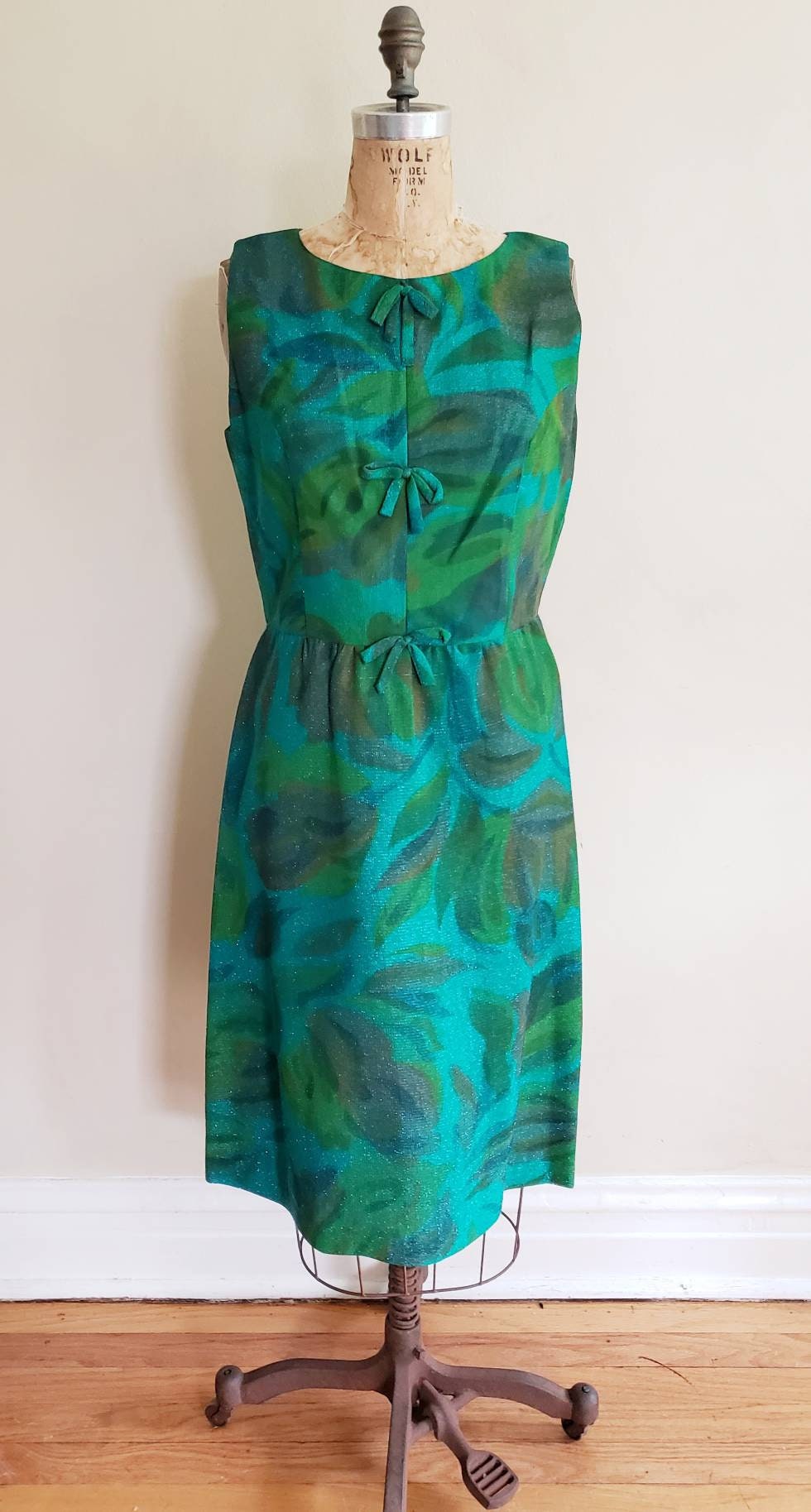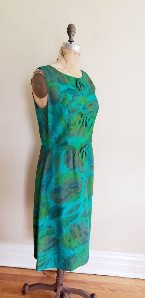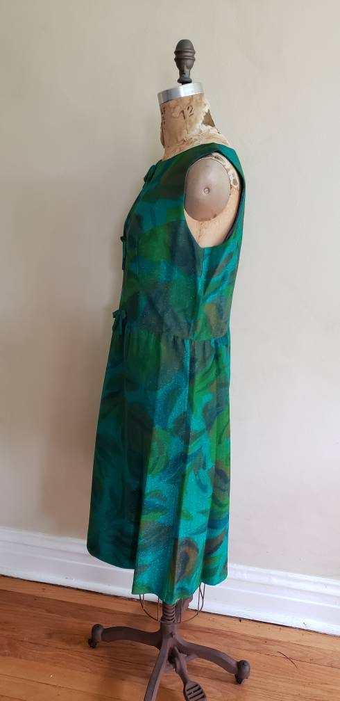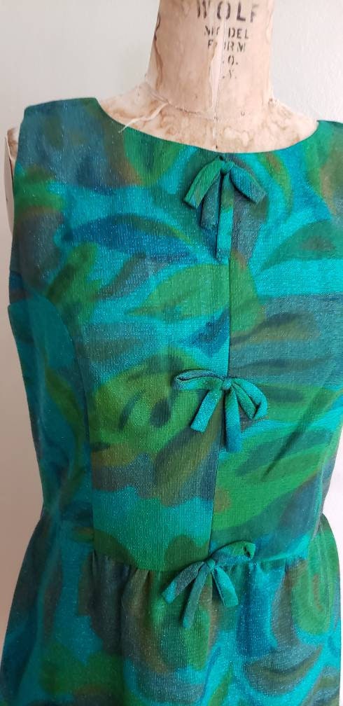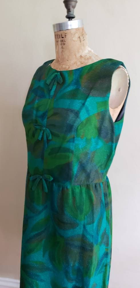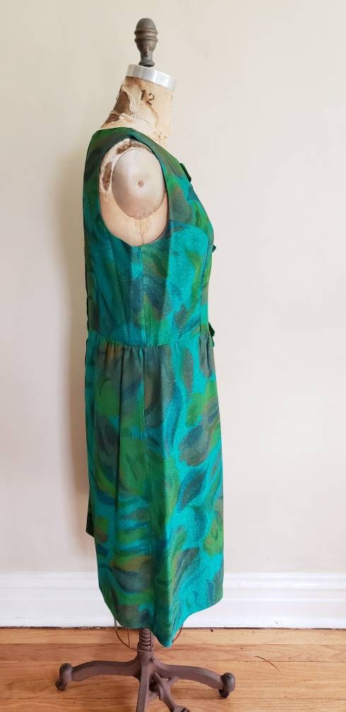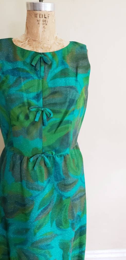 Great frock from the 60s, sleeveless with a scoop neckline, fitted chest, seamed waist and an A line skirt. There are princess seams at the chest and little bows in matching fabric at the center torso. The fabric is a gorgeous, somewhat sparkly array of brown, green, blue abstract floral print. Fully lined, it closes with a zipper down the back.