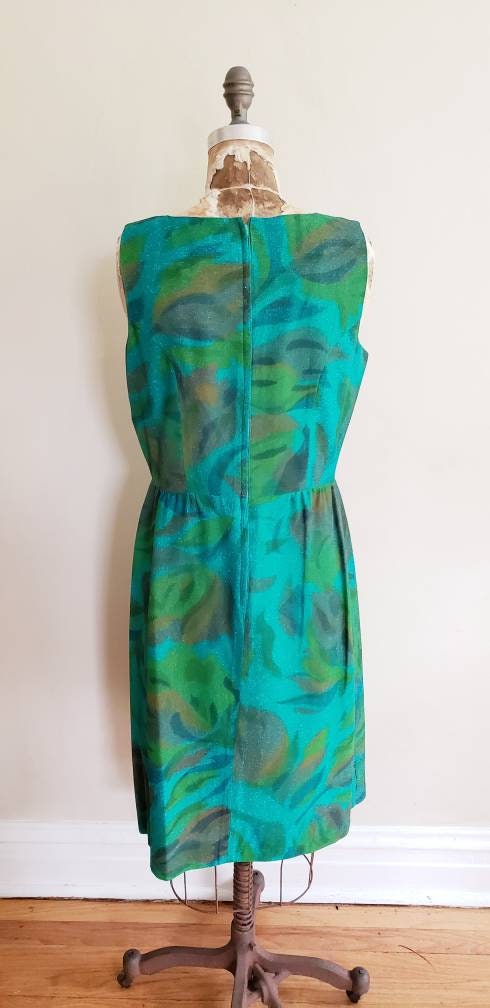 1960s Alice Edwards Green Blue Floral Print Shift Cocktail Dress / 60s Sleeveless Summer Dress Marshall Fields Large