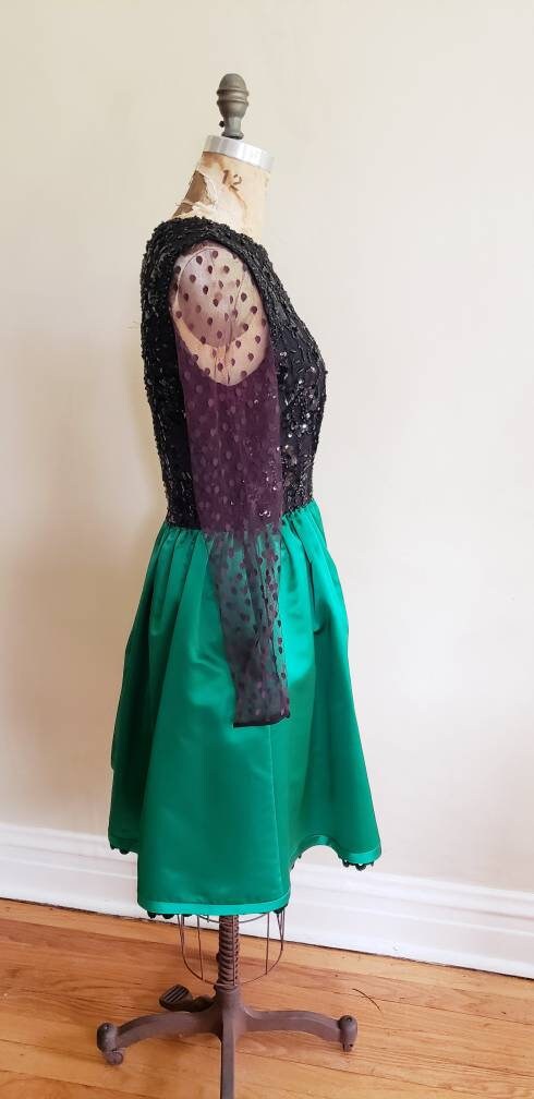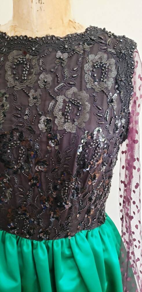 1980s Bill Blass Party Dress Black Sequins Dotted Lace Green Satin / 80s Mod Glam Designer Long Sleeved Dress / M / Clemence
