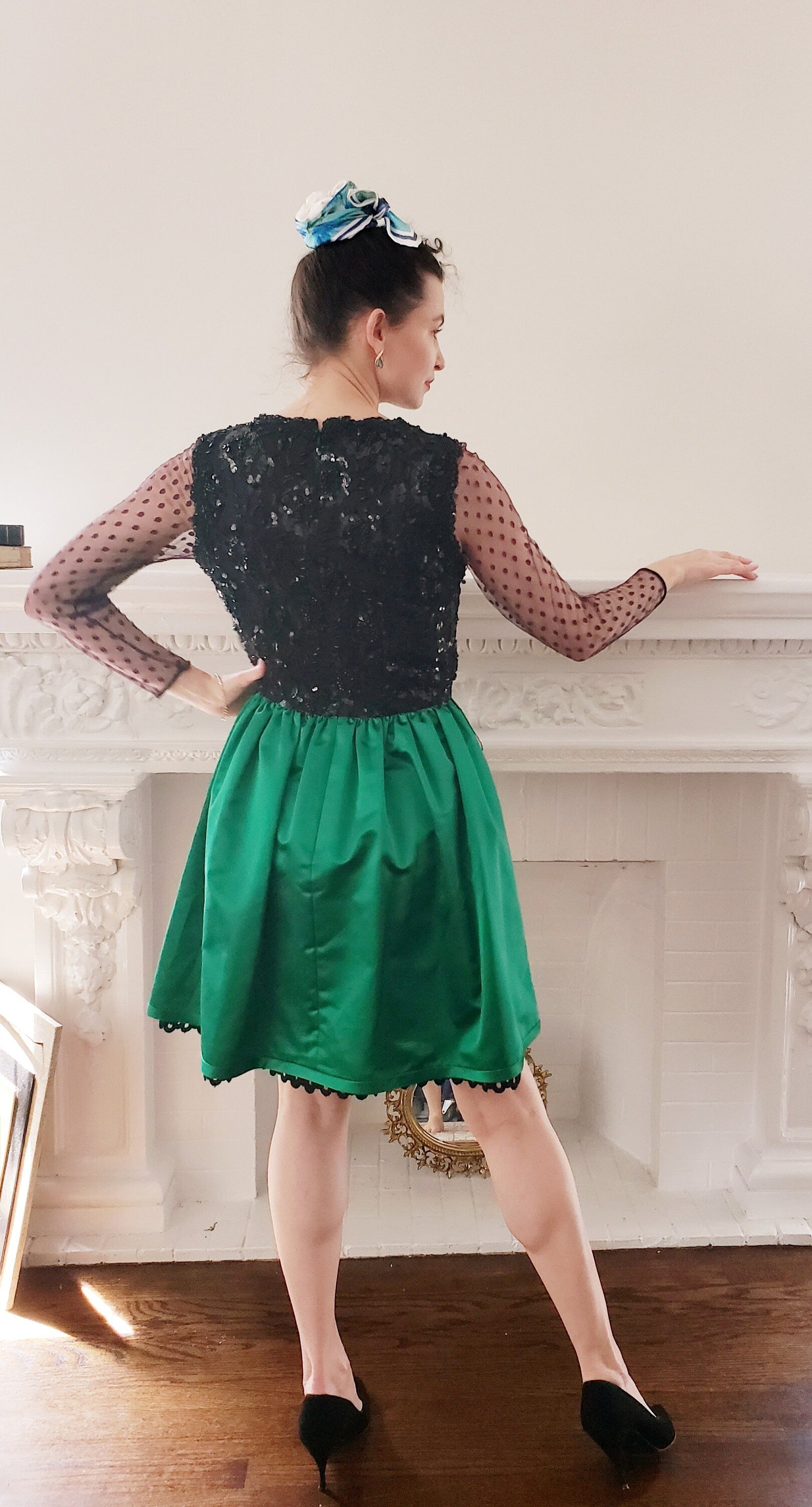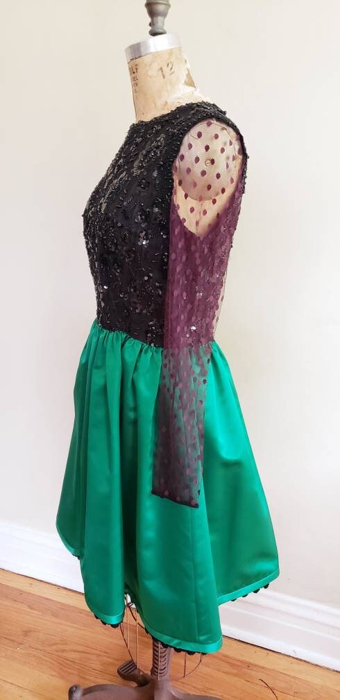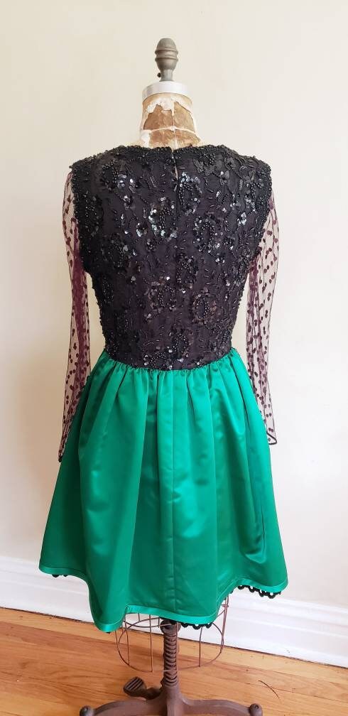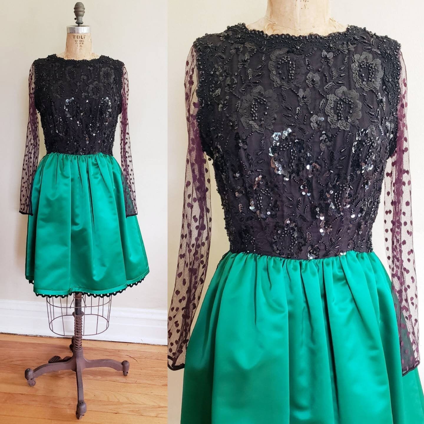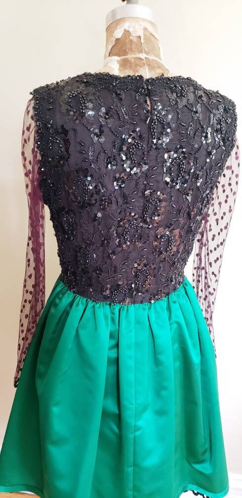 1980s Bill Blass Party Dress Black Sequins Dotted Lace Green Satin / 60s Mod Glam Designer Long Sleeved Dress / M / Clemence