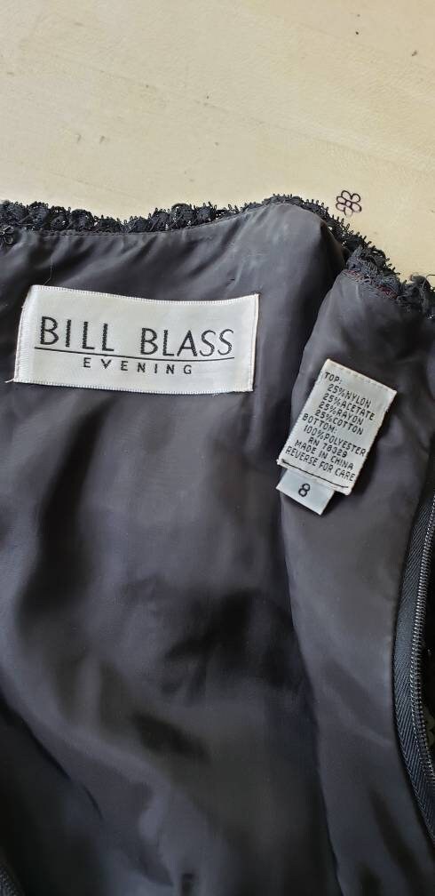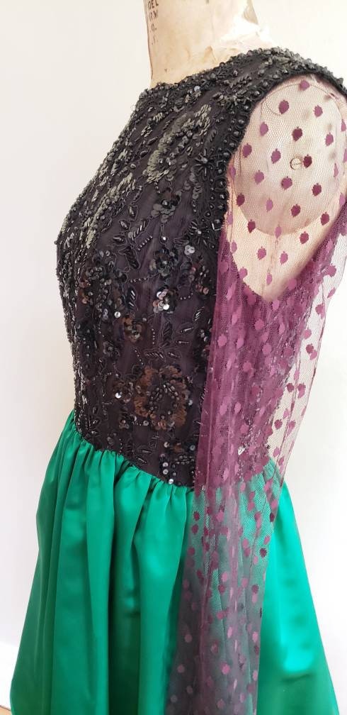 Darling and eye catching little party dress by the great American designer Bill Blass. Top is all pizzazz with long, fitted sleeves in dotted lace, while the torso is black lace bedazzled in black beads and sequins. Waist is nipped and the A line skirt flares out in a flurry of shiny, green satin. It has an underskirt in black, stiff crinoline, edged in black crochet lace - giving the skirt body, shape, and structure. Zips up down the back.