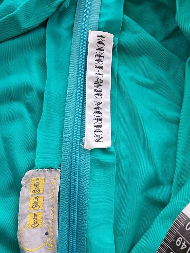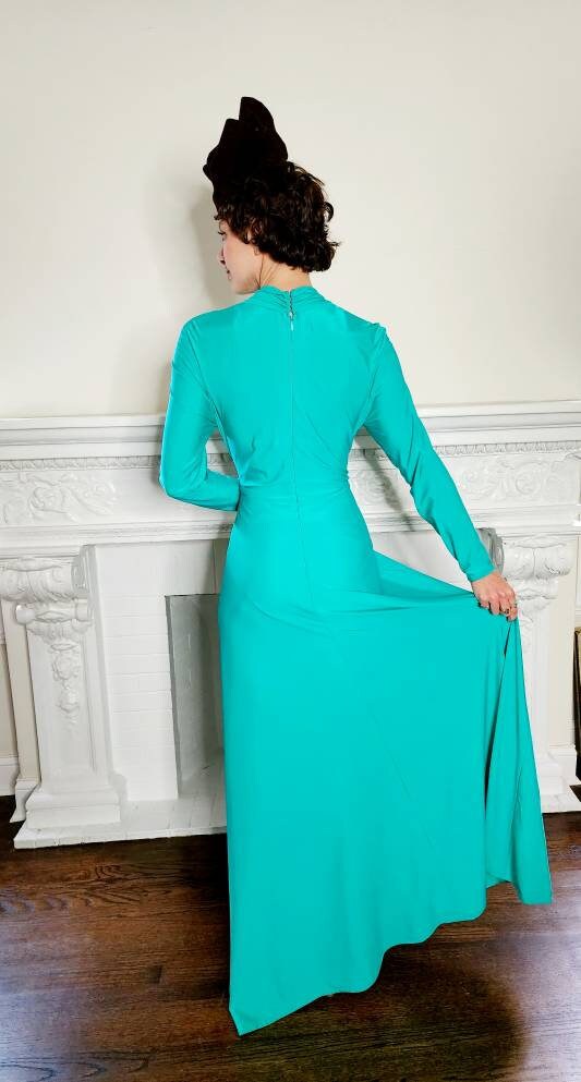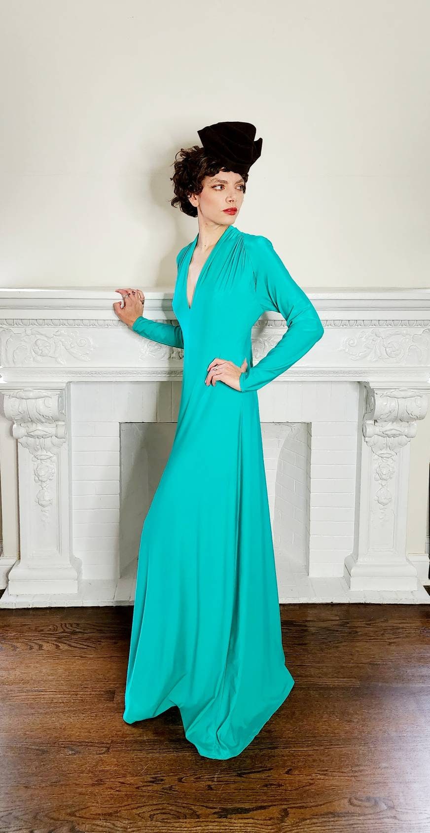 1970s Robert David Morton Matte Jersey Dress Aquamarine Green / 70s Long Sleeved Evening Dress V Neck 30s Style Disco / Med / Octavia