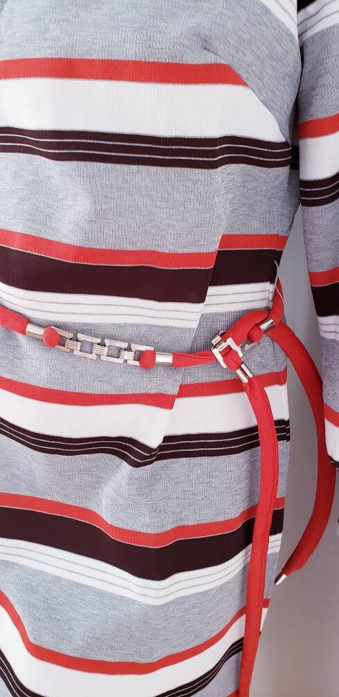 1970s Striped Day Dress Long Sleeved / 70s Belted Dress Gray Red Black Poly Bold Print / L / Daniela
